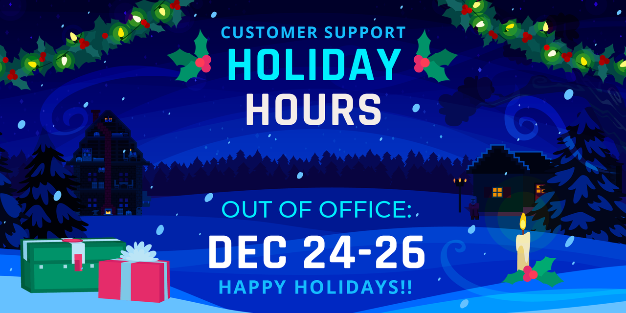 Happy holidays everyone! It's important for everyone to take a little time to enjoy the season-- including us! Our normal support hours will be interrupted from their regular schedules for the following dates: