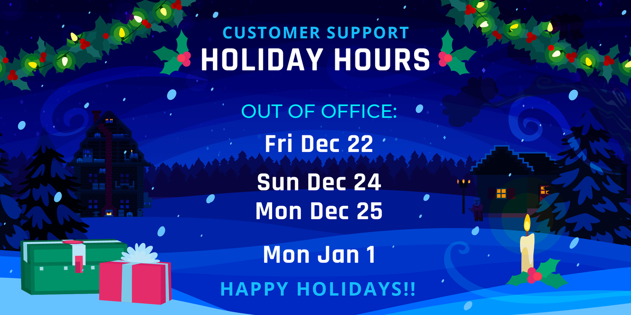 Happy holidays everyone! It's important for everyone to take a little time to enjoy the season-- including us! Our normal support hours will be interrupted from their regular schedules for the following dates: