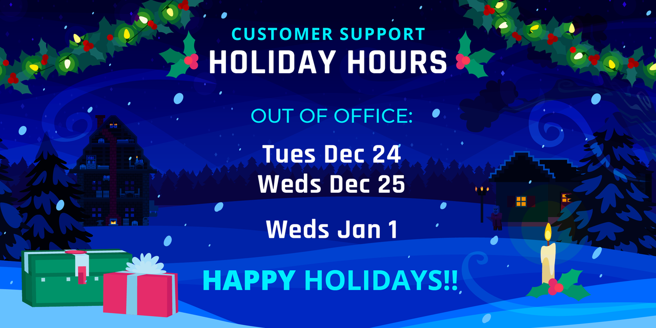 Happy holidays!! Everyone needs a little time to spend with the people you care about this time of year... including us! Our office will be closed, including the Support Team, for the following dates: